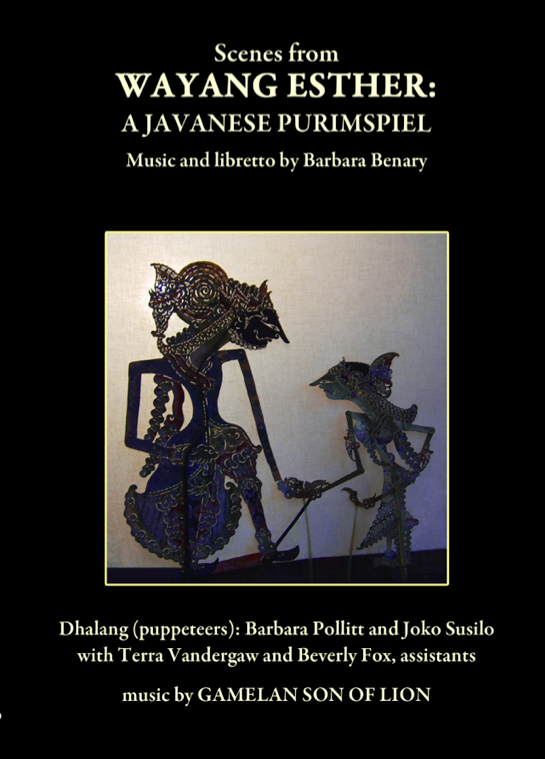 The two Barbaras have been long time collaborators over the years on a number of music and wayang projects. “Esther” is their second major collaboration, the first being “Karna: Shadow Puppet Opera (1994, LaMama).